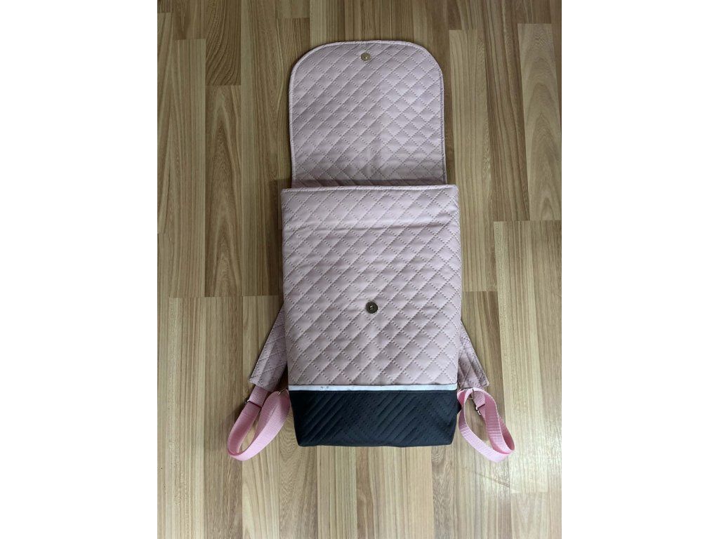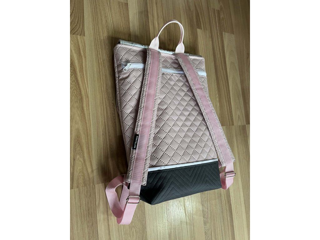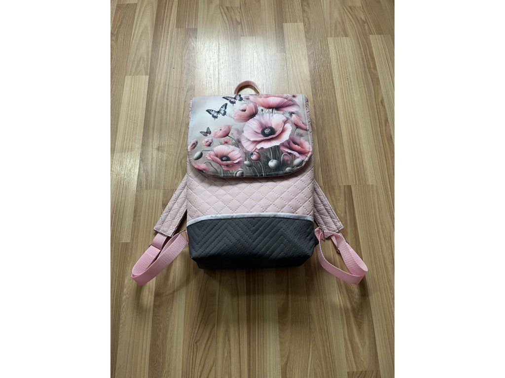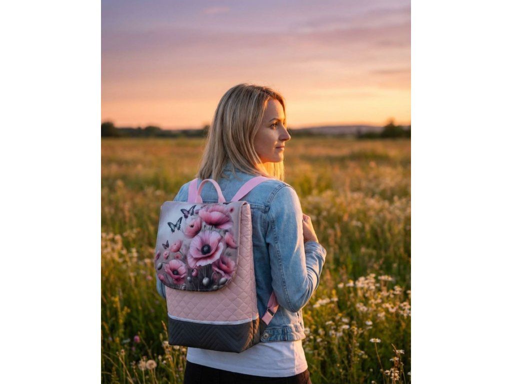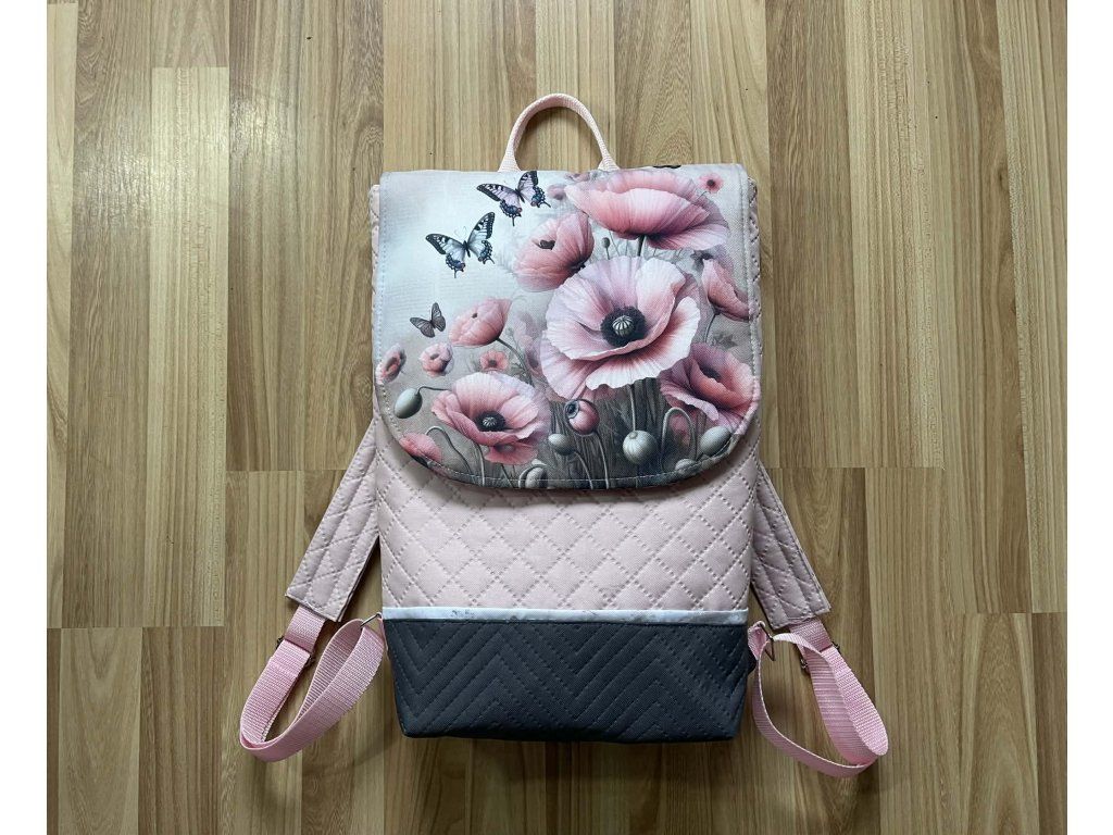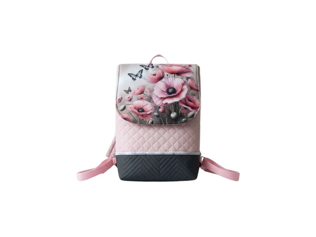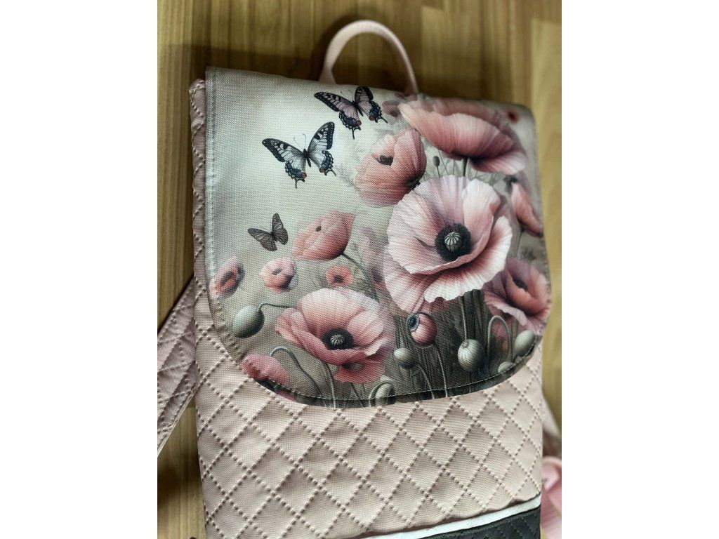 🎒 Batoh s motivem vlčích máků a motýlů v pastelových barvách růžové a béžové, ušitý z voděodolné kočárkoviny 💧. Přední a zadní díl batohu i ramenní popruhy jsou prošívané, díky čemuž batoh působí elegantně a luxusně ✨.