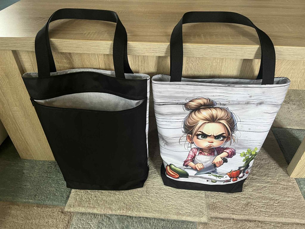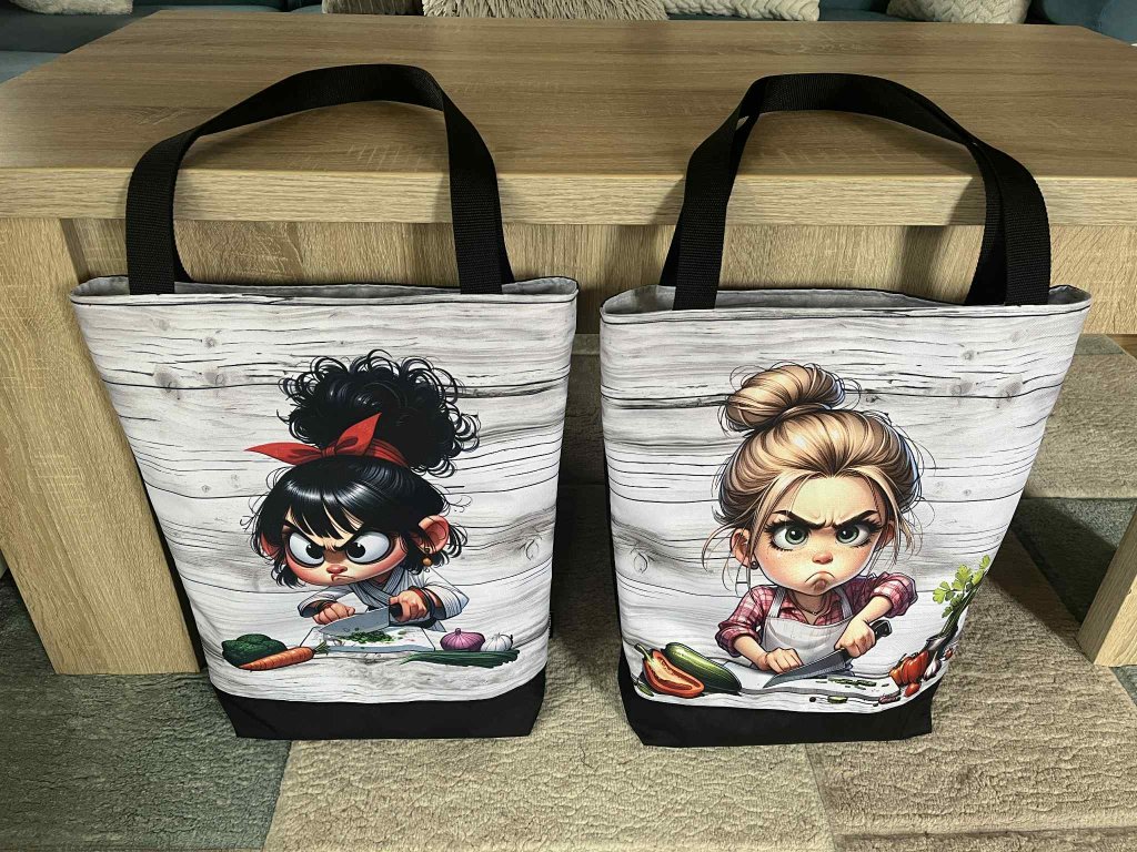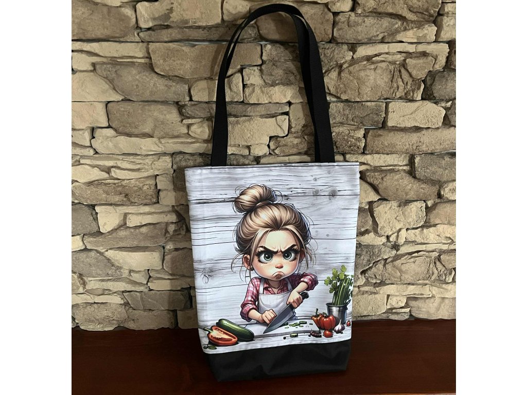 Když už musíte na nákup, tak ať to má styl. Tahle taška s obrázkem naštvané kuchařky mluví za vás – ať už vám chybí máslo, trpělivost, nebo obojí
