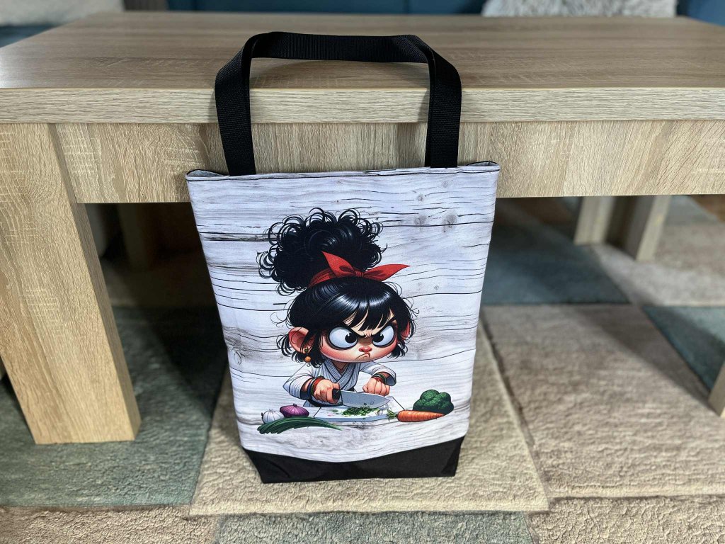 Když už musíte na nákup, tak ať to má styl. Tahle taška s obrázkem naštvané kuchařky mluví za vás – ať už vám chybí máslo, trpělivost, nebo obojí